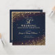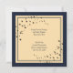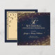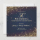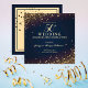 Invitación a la Fiesta de Bodas de Oro 50 Aniversario de Boda diseñada sobre un fondo de color oscuro con puntos de confeti dorados y texto de color dorado. La parte posterior está decorada con toques dorados, estrellas de color oscuro y texto. Para personalizar, simplemente inserte los detalles de su evento en nuestra plantilla fácil de usar reemplazando el texto de muestra.