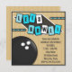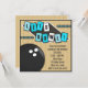 Comparte las noticias de la fiesta de cumpleaños de un niño con esta invitación a jugar boliche, fresca y brillante. Gran invitación cuadrada para niños de todas las edades. Las letras Verde azuladas, acuáticas y azules expresan Let's Bowl contra un diamante negro. El fondo está diseñado para que parezca el piso de un bol. Contáctame por los colores personalizados.