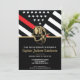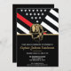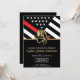 Este diseño cuenta con una bandera de bomberos con rayas blancas y negras y una delgada franja roja. El casco de un bombero se sienta sobre todo en los detalles del fiesta del bombero, teniente o fiesta de jubilación del jefe que se retira. Las invitaciones también se pueden personalizar para un graduado de la academia de bomberos.