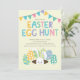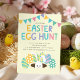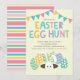 Nuestra invitación a la fiesta de Pascua de conejo de caza de huevos de Pascua presenta el conejo más lindo rodeado de huevos de Pascua en un fondo amarillo claro con una franja colorida. Personalice con su información personal y estará listo para ir.