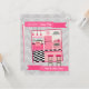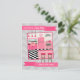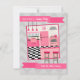 Una invitación a una fiesta de cocina con un ilustracion delante de una cocina rosa de inspiración retro decorada con suelo blanco y negro. Personalice el texto en la parte frontal y posterior. El fondo es gris claro con zags zig.