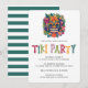 Diseño de invitación tropical con una ilustración de cabeza Tiki con follaje exuberante y un patrón de rayas en la parte posterior - esta invitación personalizada para fiesta Tiki es perfecta para una fiesta de cócteles, barbacoa de verano en el patio trasero, fiesta de piscina Tiki o fiesta Luau. Personalízala con la información de tu evento.