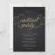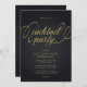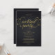 Invitación moderna y sofisticada a una fiesta de cóctel en negro y dorado con tipografía elegante.