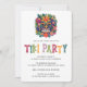 Diseño de invitación tropical con una ilustración de una cabeza de Tiki con follaje exuberante y un patrón de rayas en la parte posterior - esta invitación personalizada para la fiesta de Tiki es perfecta para una fiesta de cóctel, barbacoa de verano en el patio trasero, fiesta de piscina de Tiki o fiesta de Luau. Personalízala con la información de tu evento.
