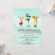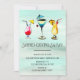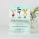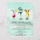 Tres cócteles de verano decoran la parte superior de esta invitación a un cóctel de verano. El cóctel de la izquierda es rosa con un paraguas amarillo. El cóctel de la derecha es amarillo y está adornado con una rebanada de cerezo y piña. Una bebida turquesa con paraguas azules ocupa el centro del escenario. Un suave lavabo azul acuático proporciona el marco perfecto tanto para la recepción como para la parte posterior de la invitación a un cóctel. Diversión de verano está escrito en una tipografía caprichosa. A continuación se detallan los detalles de su fiesta.