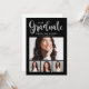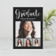 Simplemente elegante tarjeta de invitación de graduación y la invitación de fiesta presentan "Graduado" en un moderno guión de caligrafía con un moderno collage de fotos de cuatro (4) fotos del grado. El diseño de dos caras de la tarjeta incluye la redacción de la fiesta de graduación "Let's Celebrate" y detalles en la parte de atrás. Diseño clásico en blanco y negro con acentos de color plateado.