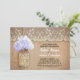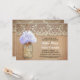 Invitación a una fiesta de compromiso rústico con un tarro de albañil con flor de hidraangea azul claro. Invitación perfecta para una fiesta de compromiso con el país con encaje vintage y acentos de madera angustiados.