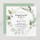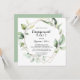 Esta invitación geométrica y elegante a la fiesta de compromiso con la vegetación dorada es perfecta para una simple celebración de compromiso. El diseño se basa en hojas de eucalipto botánico pintadas a mano, adornando un marco geométrico dorado.