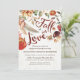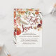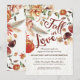 Rústica caída en el amor invitaciones de fiesta de compromiso con plumas boho, flores de otoño, hojas caídas, calabazas, hongos y manzanas.