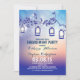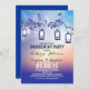 invitaciones a fiestas de compromiso rústico-azul real con luces de jardín - linternas de aceite colgando de la rama del árbol. Elegante, moderno y vintage, invita a una fiesta al aire libre con árboles y luces de cuerda.