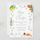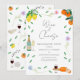 Hermosa y caprichosa invitación de boda boho de queso y vino con temática moderna y acuarela colorida, con simples elementos botánicos y un tema cítrico de naranja y limón ideal para una soleada boda europea de verano o fiesta de compromiso. La obra original de la artista Catherine Sweetman incluye follaje, flores silvestres, queso y vino, notas musicales y copas de vino burbujeante. Caligrafía caprichosa y tipografía moderna con plantillas fáciles de personalizar para agregar nombres, la fecha y otra información esencial junto con las iniciales de la novia y el novio en la etiqueta de la ilustración de la botella de vino burbujeante. La paleta de colores incluye limón, amarillo, naranja, verde, azul, púrpura y rosa.