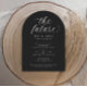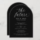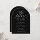 Establece el tono para una celebración chic con estas invitaciones modernas para una fiesta de compromiso en negro, que presentan una tipografía blanca elegante. El diseño en forma de arco y la disposición minimalista crean un look contemporáneo y elegante, perfecto para organizar la fiesta de compromiso de una pareja en un estilo atemporal en blanco y negro.