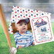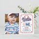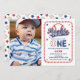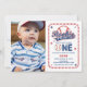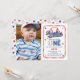 El diseño de la fiesta de primer cumpleaños del niño con el tema afligido del béisbol "Rookie del año". Presenta el texto "Rookie del año" con tema de béisbol, con un béisbol parado en la "O" en "One" junto con el pellejo de béisbol alrededor del marco rectangular redondeado. En la parte delantera también aparece la foto de su hijo. El reverso presenta un patrón repetido de estrellas y pelotas rojas y azules en problemas.