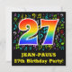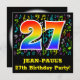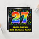 La parte delantera de este divertido, colorido y emocionante diseño de invitación para fiestas de cumpleaños incluye un gran número de "27" con un patrón inspirado en el gradiente del espectro arcoiris, junto con un nombre personalizado y el mensaje "¡Fiesta de cumpleaños número 27!". Parte del fondo tiene un patrón de símbolos y notas musicales divertidas y coloridas. En la parte posterior se incluye información personalizada relativa al evento al que se invita a los posibles invitados. Joyosas y personalizadas tarjetas de invitación para fiestas de cumpleaños como esta pueden ser enviadas a potenciales invitados de una reunión que se lleva a cabo para honrar a un compositor de canciones, a un músico, a un cantante, o a otros por su vigésimo séptimo cumpleaños. [~Z0000427]