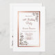 Una elegante invitación a la fiesta de 50 años de oro/cobre floral bordeada de rosa con adornos florales de oro cálidos en las esquinas diagonales y texto en burdeos.