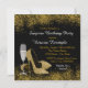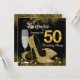 Invitación de sorpresa para la fiesta de cumpleaños 50 con elegante copa de champán y zapatos de tacón alto de oro. Puede personalizar fácilmente esta invitación de cumpleaños 50 con elegante diseño negro y oro para su evento simplemente agregando sus detalles en el estilo de fuente y color, y redacción de su elección.