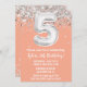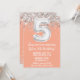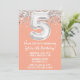 Peach and Silver 5 años invitación a fiesta de 5 años de edad invitación a fiesta de 5 cumpleaños con escritura de escritura purpurina y moderna y globos de Relieve metalizado divertidos.