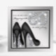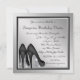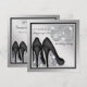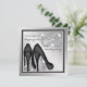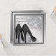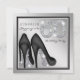 Invitación de cumpleaños 60 para mujer con zapatos de tacón alto negros y plateados y número 60 de diamantes. Esta elegante invitación de cumpleaños 60 sorpresa en negro y plateado se personaliza fácilmente para su evento.