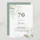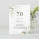 Esta invitación a la fiesta de cumpleaños número 70 de la caligrafía de eucalipto de oro es perfecta para una fiesta de cumpleaños rústica. Este diseño artístico presenta acuarelas de color oro y follaje verde dibujadas a mano, que inspiran la belleza natural.