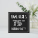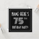 La fachada de esta elegante y inspirada tarjeta de invitación para fiestas de los años 1920-1930 presenta un nombre personalizado, un intrincado estilo Art Déco inspirado en el número "75", el mensaje "¡FIESTA DE CUMPLEAÑOS!" y un borde multilínea. El fondo del frente es negro de color de forma predeterminada, pero se puede personalizar a un color diferente si se desea. En la parte posterior se incluyen detalles personalizados sobre el evento, como la fecha, hora, lugar/lugar y cualquier otra información importante. Invitaciones elegantes y editables como estas podrían ser usadas para invitar a los asistentes a una reunión de cumpleaños que se lleva a cabo en celebración del cumpleaños 75 de alguien. [~Z0000615]