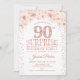 Sorpresa 90 cumpleaños, invitación para las mujeres. Elegante carta de invitación con oro rosa rosa, blanco y falso purpurina. Presenta tipografía de escritura, rosas y letras de diamante. Perfecto para la elegante celebración sorpresa del sábado.