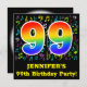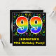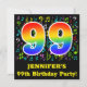 El frente de este divertido, emocionante y colorido diseño de invitación a fiestas de cumpleaños incluye un gran número de "99" con un patrón inspirado en el gradiente del espectro del arco iris, junto con un nombre editable y el mensaje "¡Novena fiesta de cumpleaños!" Parte del fondo cuenta con notas musicales divertidas y coloridas y un patrón de símbolos. En la parte posterior se presentan detalles editables sobre el evento al que se invita a los clientes potenciales. Tarjetas invitadas felices y editables para la celebración de cumpleaños como esta pueden ser enviadas a los potenciales invitados de una reunión de celebración que se está llevando a cabo para celebrar el compositor de una canción, el de un músico, el de un cantante o el cumpleaños noventa de alguien más. [~Z0000427]