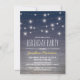 Invitaciones de cumpleaños para hombres adultos con un fondo de madera rústica con ombre azul, luces de hadas en el muelle del puerto y texto moderno.