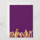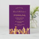 Una invitación para una elegante fiesta de cumpleaños número 21 (o cualquier edad) para ella, mujeres. Un elegante fondo púrpura femenino con un falso perfil de ciudad dorado como decoración. El texto: El nombre está escrito con una escritura de estilo con letras a mano moderna y dorada. Plantilla para el nombre y detalles del fiesta.