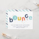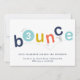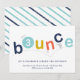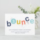 Esta invitación para fiesta de cumpleaños con brincolín presenta letras rebotando en azul marino, aqua, amarillo y naranja con la edad editable en la O.