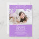 La invitación a la fiesta de cumpleaños de fotos para los niños incluye flores de Relieve metalizado plateado (efecto) y el fondo de color púrpura lavanda. Elegante y moderna fiesta de cumpleaños.