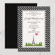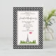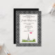 Una invitación de fiesta de cumpleaños con un tema francés. El fondo está compuesto por un patrón de lunares en blanco y negro. Un marco blanco con borde negro superpuesto. Un dibujo caprichoso con la Torre Eiffel al fondo rodeado de árboles verdes.