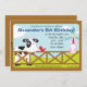 Esta encantadora invitación a la fiesta de cumpleaños incluye una escena de una granja con una vaca en blanco y negro detrás de una cerca. Un pájaro y un conejo están sentados en la cerca, y se puede ver una turbina eólica en el campo. personalizable completo.