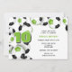 Esta invitación a la fiesta temática del fútbol incluye grupos de bolas de fútbol de color verde brillante, negro y blanco en los bordes izquierdo y superior del frente y un solo grupo que cubre la parte posterior de la invitación - personalizar los detalles del fiesta sobre un fondo blanco - de katz_d_zynes