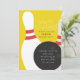 Una invitación de cumpleaños moderna y neutral en cuanto al género que incluye una bola de bolos y 2 bolos. Invita a amigos a celebrar y jugar un divertido juego de bolos para celebrar el cumpleaños de tu hijo. El respaldo con patrón coordinado se puede quitar para hacer espacio para información adicional de la fiesta como direcciones.
