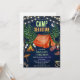 ¡La aventura espera! Celebra a tu pequeño explorador con esta maravillosamente detallada invitación de cumpleaños para una fiesta de camping. Un mágico cielo nocturno de color azul marino establece la escena con elevados pinos, una tienda de campaña naranja brillante, una hoguera crepitante con malvaviscos asándose, linterna, botas de senderismo, bolsa de dormir, huellas de oso y luces de cuerda brillantes — todo lo que una verdadera aventura al aire libre necesita.
