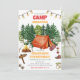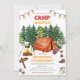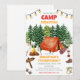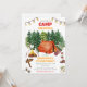 ¡Que comience la aventura! Celebra a tu pequeño explorador al aire libre con esta brillante y alegre invitación de cumpleaños para una fiesta de camping. Un fondo blanco fresco muestra exuberantes pinos, una tienda naranja brillante, una fogata crepitante con malvaviscos asándose, linterna, botas de senderismo, bolsa de dormir, huellas de oso, un letrero de camping y cálidas luces de cuerda: todo el encanto de un campamento real.