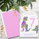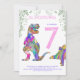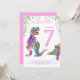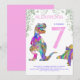 Celebra a la niña que ama los dinosaurios cumpliendo 7 años con esta invitación rugiente de color rosa, teal y púrpura con un T-Rex y un estegosaurio adorable que invita a los fanáticos de los dinosaurios a una fiesta de cumpleaños número 7. Personaliza esta invitación colorida y psicodélica de Tyrannosaurus y estegosaurio agregando el nombre de la cumpleañera, el número del cumpleaños y los detalles de la fiesta y estarás listo para una divertida fiesta de cumpleaños temática de dinosaurios rosados. Todas las especies de dinosaurios son bienvenidas. Ilustraciones de dinosaurios de la era jurásica prehistórica, obra original del artista Catherine Sweetman.