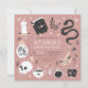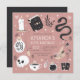 Planee su fiesta de cumpleaños con temática de adivino, gitano o Halloween con estas espeluznantes invitaciones de moda en una paleta de colores inspirada en la naturaleza boho. El diseño incluye ilustraciones de una serpiente, libros de ortografía, velas, tarros, cráneos, tarjetas de tarot y pociones alrededor de los detalles de tu fiesta de cumpleaños.