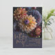 Plantilla de invitación para fiesta de cumpleaños con flores de dahlia de bonito. Las fuentes modernas y los colores de azul oscuro-violeta con color melocotón hacen un diseño único e inolvidable para una celebración de un hito. El texto escrito a mano "fiesta de cumpleaños" está junto a la información impresa del fiesta que se alinea a la derecha. Un ramo de magníficas dahlias decora la parte superior de las cartas. Revertir es color rosa polvoriento. Esta invitación también viene como descarga instantánea.