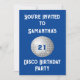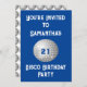 Discoteca Fiesta Retro Invitación divertida de cumpleaños - Cualquier edad. Por Ella O Él. Se Puede Personalizar. Azul y Plata con texto vintage. Divertido tema de la discoteca Purpurina Bokeh. Ideal para cumpleaños, aniversarios y graduaciones.
