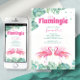 ¿Escapando a los trópicos para un divertido fin de semana de cumpleaños? Invite a sus mejores amigas con estas invitaciones chic y femeninas en rosa, azul turquesa y exuberante vegetación. Este diseño moderno presenta mi original obra de arte de flamenco rosa y hojas verdes pintadas a la acuarela. Personalice los colores de los puntos. Personalice la plantilla con los detalles de la fiesta - perfecta para un baby shower con tema tropical, fiesta de cumpleaños de verano, despedida de soltera, fin de semana de chicas, duchas nupciales y más! Para ver el conjunto a juego visite www.zazzle.com/vginvites