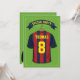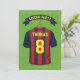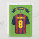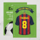 Invitaciones de cumpleaños con tema de fútbol que presentan un fondo de campo de fútbol verde, una camiseta deportiva a rayas burgundy y azul con tu nombre y número, un balón de fútbol, y una plantilla de fiesta moderna.