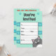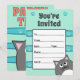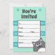 Gato gris divertido asomando la cabeza desde la esquina inferior derecha. Tiene una barriga blanca, ojos grandes y redondos y orejas rosadas. El fondo es de color menta claro con tres franjas azul claro que tienen un contorno azul oscuro, plantillas para agregar los detalles de su fiesta están en una caja blanca en la parte frontal de la invitación.