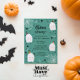 ¡Celebra tu día especial de tu pequeña con esta adorable invitación a la fiesta de cumpleaños de Halloween! Con un fondo verde azulado juguetón y fantasmas lindos con gorras fiestas, esta invitación es perfecta para una celebración hábil. El diseño divertido y festivo prepara el escenario para un cumpleaños con temática de Halloween lleno de trucos, dulces y alegría. Personalízalo con todos los detalles del fiesta y envía una invitación que seguramente encantará a los invitados y hará que el gran día de su hijo sea inolvidable.
