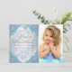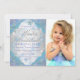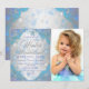 Invitación de fiesta de cumpleaños de invierno con hermosos copos de nieve azules y morados y tipografía plateada elegante sobre un fondo de copos de nieve morados y azules. Esta elegante invitación de fiesta de cumpleaños de invierno de copos de nieve se personaliza fácilmente para su evento simplemente agregando su foto y detalles en el estilo de fuente y color y redacción de su elección. Este es un diseño impreso sin purpurina real, joyas, etc.