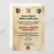 Todos los niños merecen una fiesta mágica de cumpleaños. Celebre la ocasión con esta encantadora invitación especialmente diseñada para incluir adorables emblemas colocados en un pergamino inspirado en un fondo para un fiesta verdaderamente vinculante. También se puede adaptar para una fiesta de Halloween.