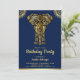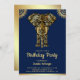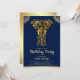 Sorprenda a sus huéspedes con esta tradicional invitación de cumpleaños que incluye un elefante falso de oro bellamente decorado con un fondo azul. Simplemente agregue los detalles de su evento en esta plantilla fácil de usar para convertirla en una invitación única. Girar la carta para revelar una textura falsa de Relieve metalizado dorado en la parte posterior de la tarjeta.
