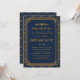 Estas invitaciones para fiestas de cumpleaños incluyen una paleta de colores azul y dorado, un marco geométrico, patrones geométricos y otros detalles estilísticos inspirados en el Art Decó y los años veinte. Puede personalizar los campos de texto de ejemplo a su gusto.