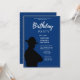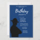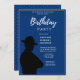 Invitación de cumpleaños azul y oro para un patrono de autopista. El diseño tiene una silueta de un soldado de estado.Agregue su mensaje personalizado y otros detalles importantes a su invitación.