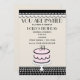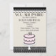 Invitación a una fiesta de cumpleaños con una combinación de colores rosa, negro y blanco. Fondo beige y papel metálico de champán. Ilustracion de una tarta de cumpleaños rosa y negra en la parte inferior sentada en un puesto de tortas blancas y un mantel blanco con polka punto negro. La parte superior tiene un borde de vieira blanco y negro. El texto es negro. Personaliza con detalles de tu ocasión y edad en pastel.